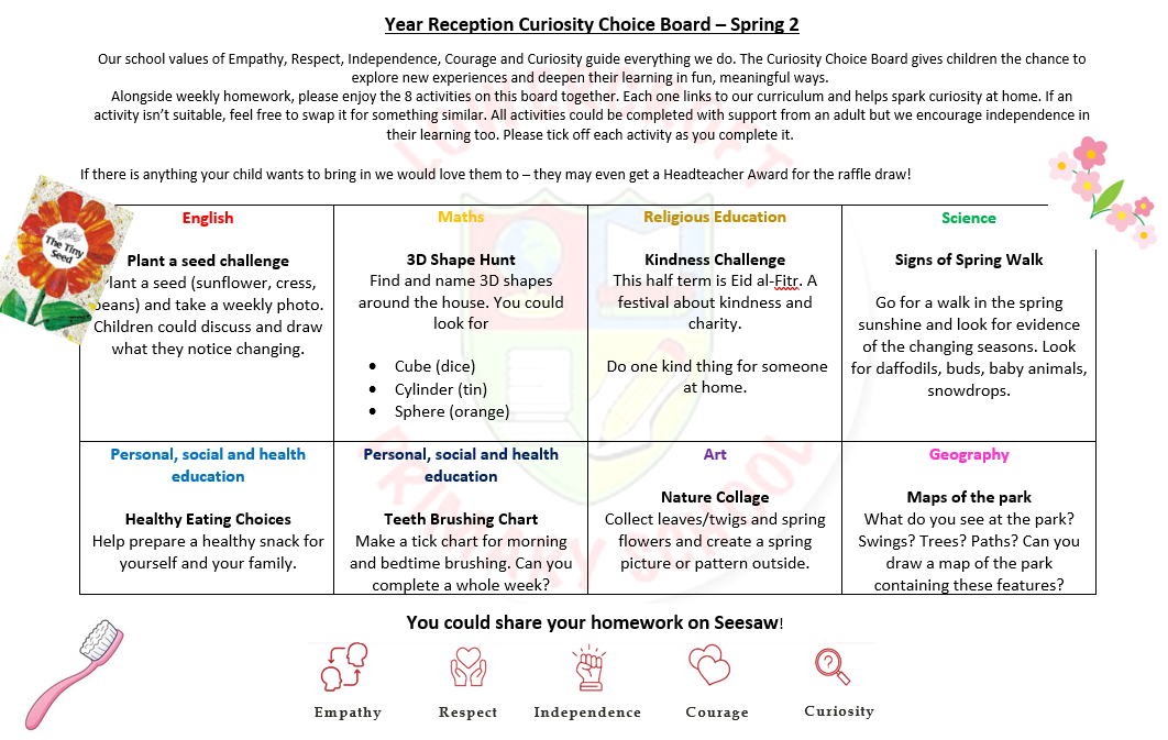 Please see below for our optional home learning opportunities for this half-term. For further information on expected homework, please visit the Homework page under the Children menu.
