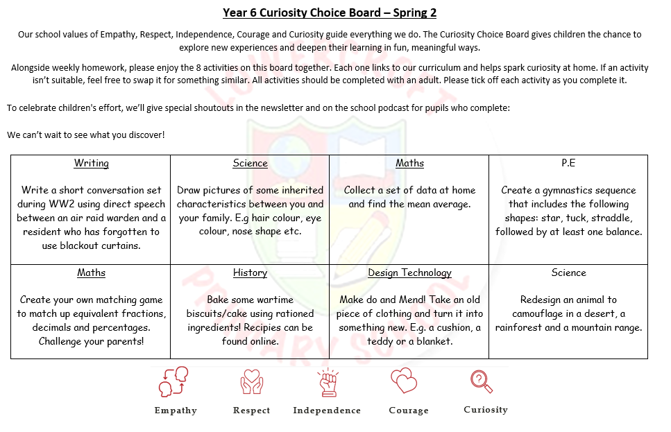 Please see below for our optional home learning opportunities for this half-term. For further information on expected homework, please visit the Homework page under the Children menu.
