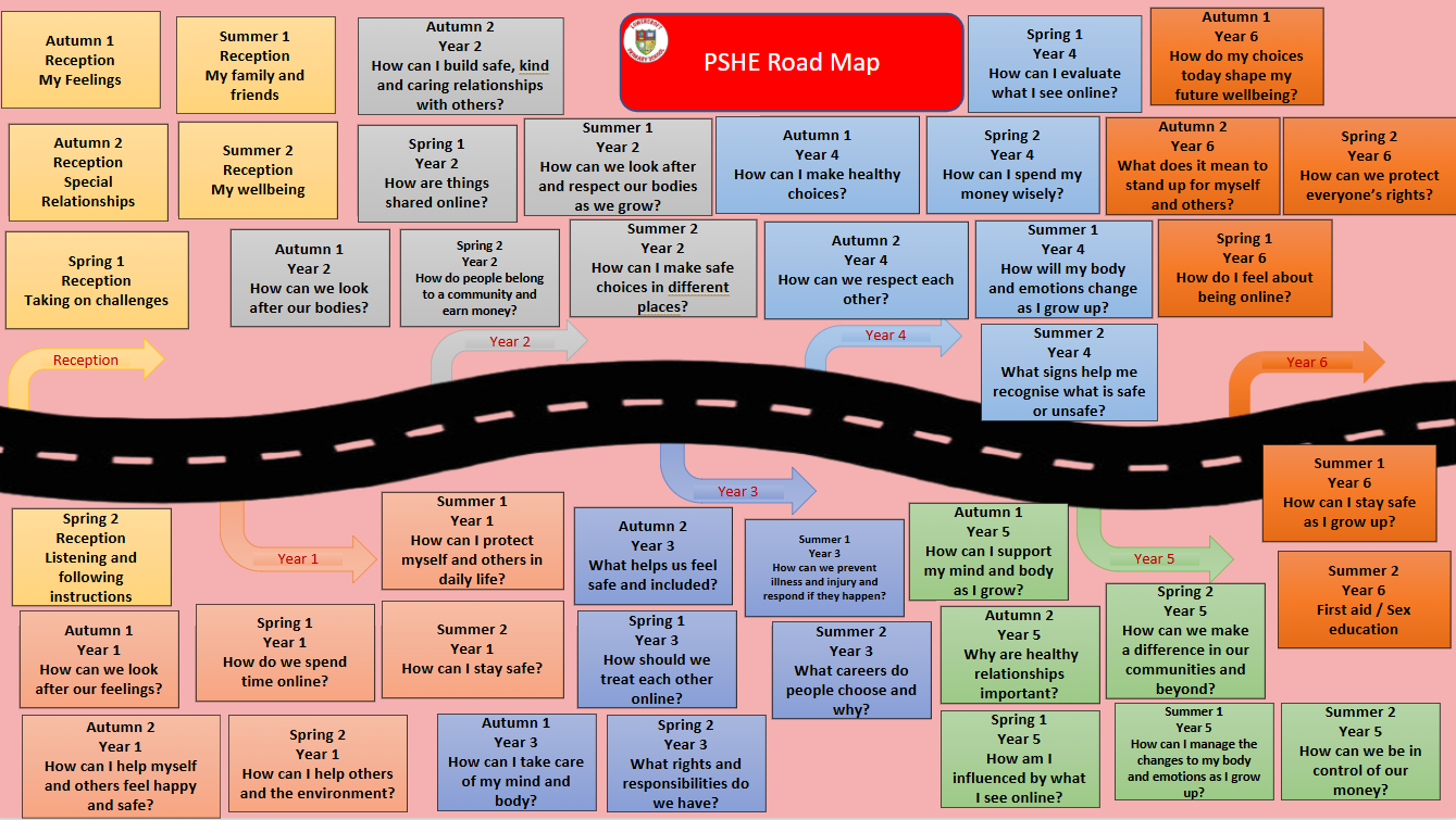 Weekly lessons use a range of engaging, age‑appropriate pedagogies such as discussion, circle time, modelling, scenarios, role‑play and practical tasks to ensure all learners can access and apply new knowledge and skills. The road map for each year group clearly shows how learning develops over time—from early self-regulation and relationships in EYFS, through online safety, health choices and citizenship themes in Key Stage 1 and 2, to financial wellbeing and age‑appropriate puberty and RSE content in upper Key Stage 2.